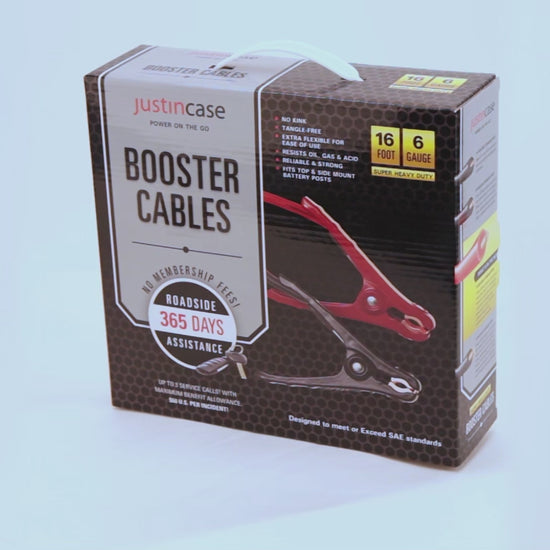 [This review was collected as part of a promotion.] Every vehicle should have a good set of battery booster cables on hand in case of emergency. These booster cables from the brand “justincase” had good reviews and were a fair price. They are designed to work on batteries in all standard automobiles. The box description states the cables work on both top-terminal post batteries, and side-terminal post batteries. The box description also states the cables are super heavy duty, kink-free, and tangle-free. They do feel flexible, but sturdy. I chose the 16 ft length cables because you can't always maneuver the “rescue car” close to the car with a dead battery. I will store the cables in the original box because the box has good, easy-to-follow instructions on it, including pictures. The box mentions a free Roadside Service, up to 3 times in a year, with certain restrictions. I didn't look into it because I already have free roadside assistance. If true, though, that would be an extra perk.